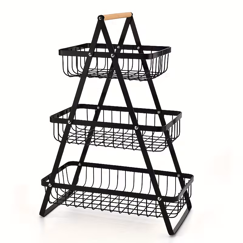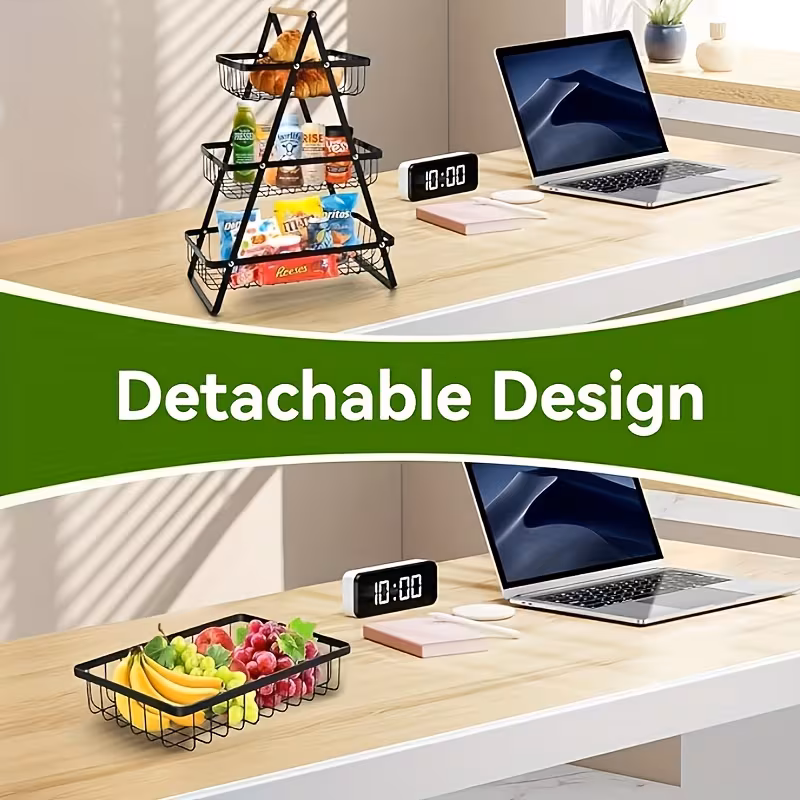 This 3-tier fruit holder is perfect for organizing fruits, vegetables, bread, snacks, spice jars, and more, helping to declutter your kitchen counter, pantry, or bathroom with plenty of storage. Featuring a generous three-level structure, our fruit basket is ideal for storing an assortment of fruits and vegetables, from blueberries to apples and potatoes, providing an organized and space-efficient option. Designed for ease of use, our fruit basket comes with easy-to-carry wooden handles, perfect for picnics, family events, or camping trips, and its three-tier design suits any situation. This item serves both a practical and aesthetic purpose, enhancing the look of your kitchen or dining space while effectively organizing and showcasing your fruits and vegetables.