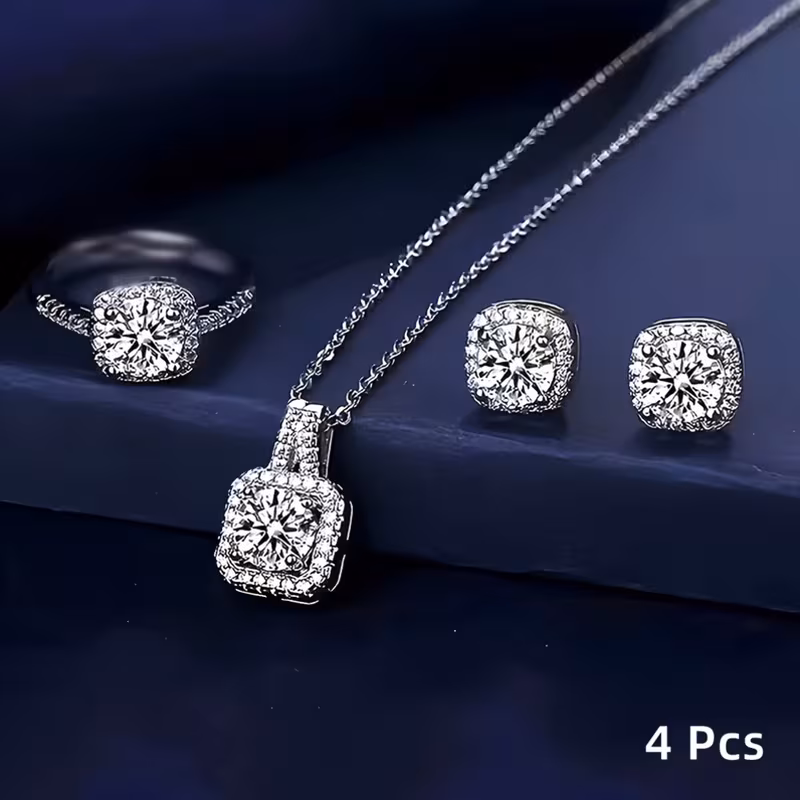 Set of 4 pieces includes 1 pendant necklace, 1 ring, and 2 earrings. This jewelry set features sparkling cube zircon and rhinestones, showcasing exquisite cuts for stunning brilliance. It's stylish and versatile, perfect for any occasion