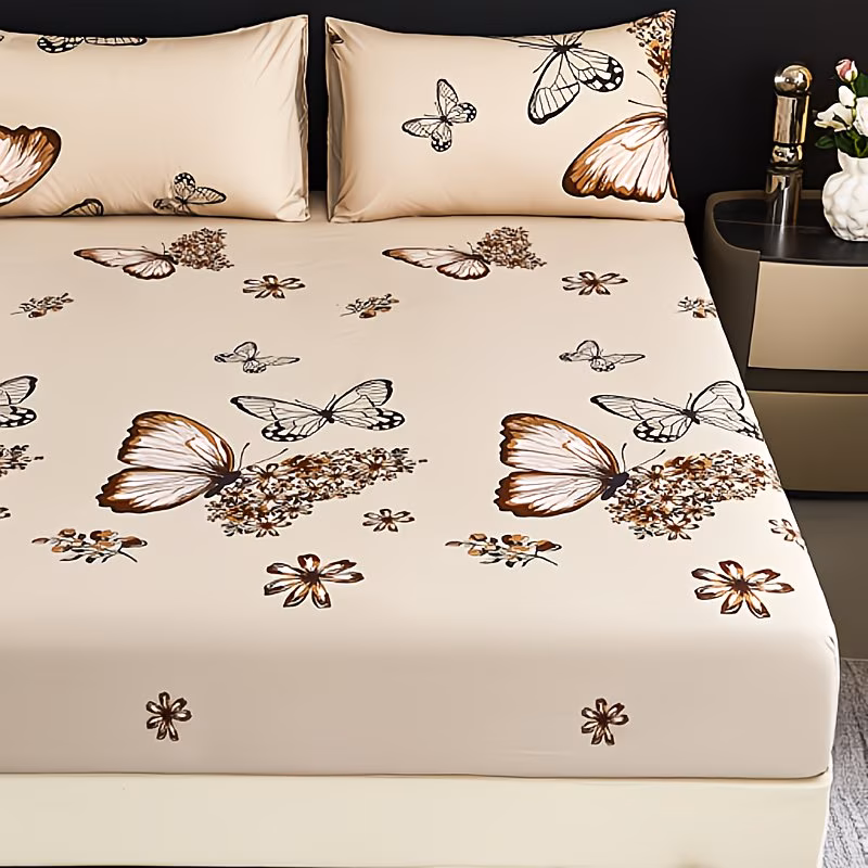 Butterfly Floral Printed Bed Sheet Set (1 Fitted Sheet + 2 Pillowcases), Designed with a Strong Sense of Style, Made with Brushed Fabric for Comfort And Skin-Friendliness, Featuring Reactive Dyeing That Doesn'T Fade And Is Shrink-Resistant. Suitable