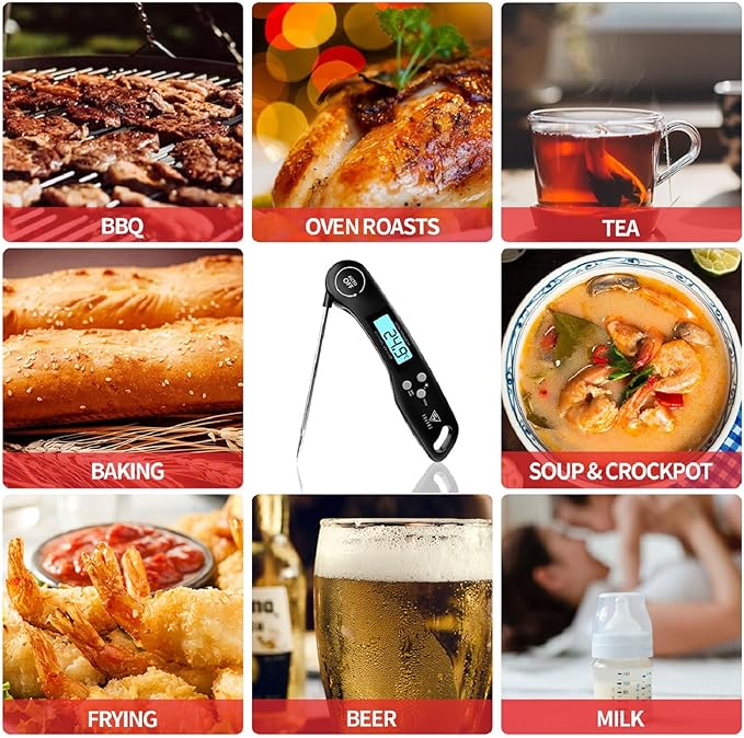 • Reversible Backlight Display: Large backlit LCD screen automatically rotates based on how you hold the food thermometer– works perfectly for both left and right hands. Bright backlight provides spectacular clarity in dark kitchens, smoky grills, or dim outdoor settings. No more squinting or awkward angles. The display shows readings clearly whether you’re checking a roast at midnight or grilling at dusk