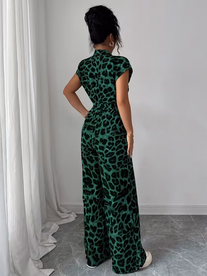 European and American Spring/Summer New Random Print Stand Collar Vacation Style Elegant Casual Belted Jumpsuit