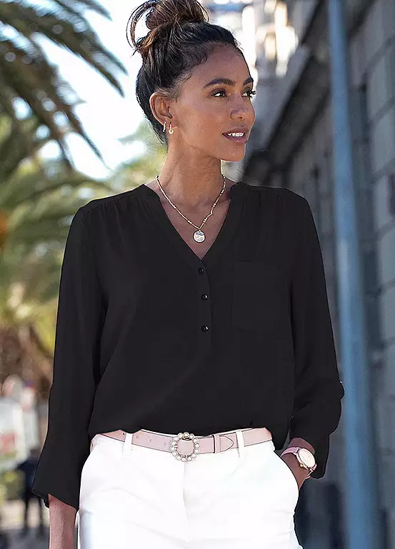 A versatile slip-on blouse in a slim fit and with a straight hem for added comfort. In addition, there is a V-neckline with a short button placket and cropped-length sleeves with tabs for rolling up when desired.