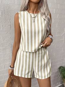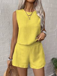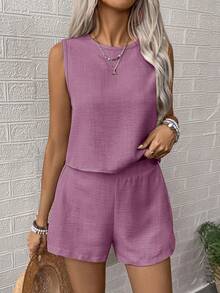 100 % polyster , Machine wash , 2pcs Women Floral Print Round Neck Sleeveless Shirt And Shorts Casual Set, Perfect For Vacation