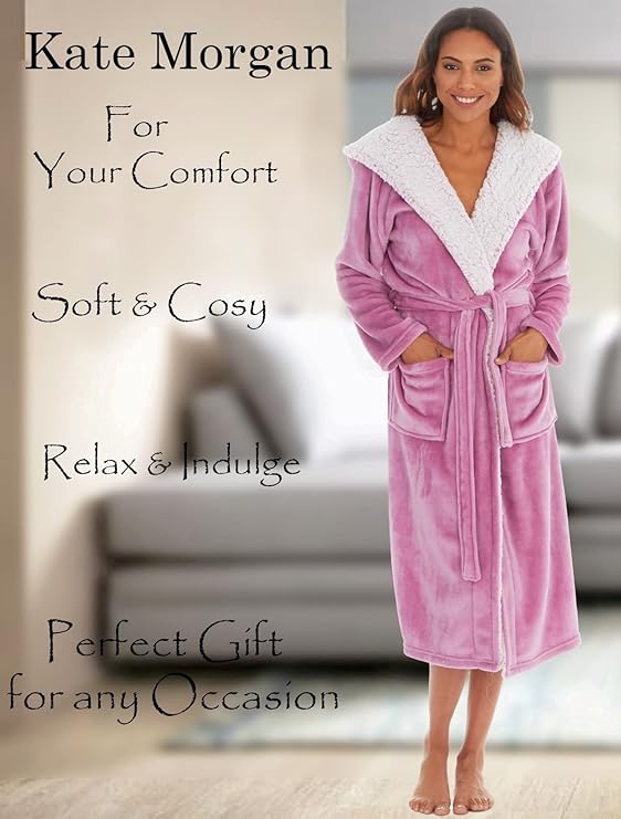 About this item ✅ KATE MORGAN Ladies Soft Luxurious Hooded Gorgeous Snuggle Borg Dressing Gown, in UK sizes Small (8-10), Medium (12-14), Large (16-18), XL (20-22) ✅ BRILLIANTLY SOFT & COMFY: These ladies Kate Morgan Snuggle Borg dressing gowns are super soft and comfy, allowing you excellent comfort on those chilly days and when the weather is cooler. With 2 front pockets, they are hooded to keep you warm, a belt to tie it according to your requirement to keep you cosy and warm whenever these are on ✅ SPLENDID FOR THOSE LAZY DAYS: Whether you want to chill out and relax in bed on those lazy days until you feel ready to get up, or be it on a take it easy weekend or when you have time off from work, these ladies Gowns are perfect as a piece of loungewear when you want to unwind, slow down and de-stress whilst looking ultra stylish! ✅ GORGEOUS COLOURS: These Snuggle Womens Gowns are available in several colours as can be seen, the choice is yours whilst stocks last. Made with pockets for practicality which also keep your hands warm, you'll want to wear them whenever you are lounging! You can also turn the heat a little lower and wrap up in this classy housecoat to stay warm. ✅ A GENUINE OFFICIAL KATE MORGAN PRODUCT: Ideal for oneself and also this Dressing Gown makes the perfect gift for her!! Go on and treat her by presenting her this Dressing Gown for the bliss & comfort she deserves!