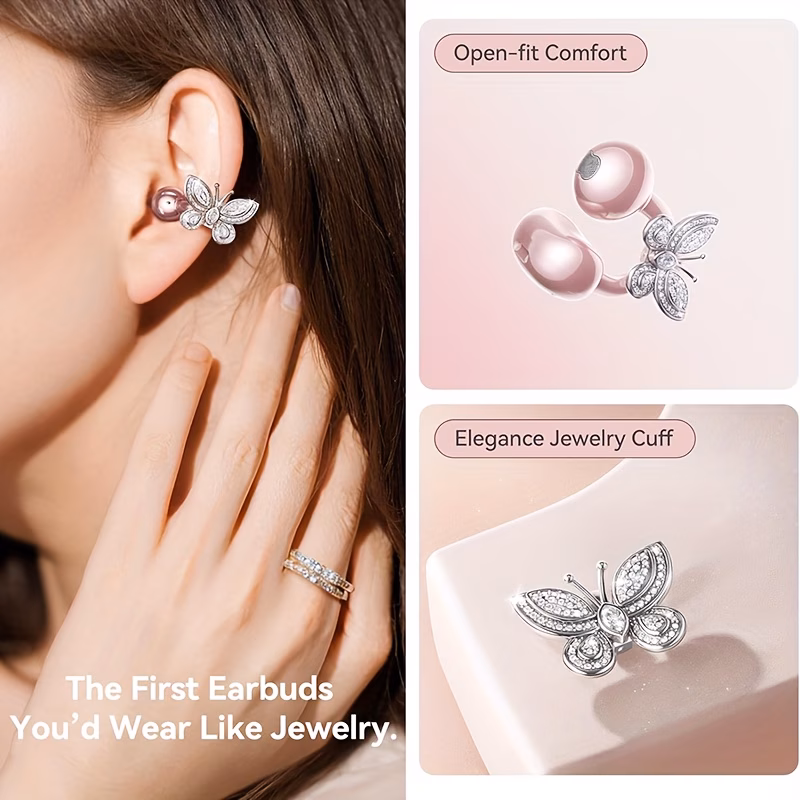 Wireless Clip-on Headphones, with Detachable Gemstone Earring Accessories, BT 5.4, Hi-Res EQ Sound, 10mm Drivers with Big Bass, ENC, 40H Long Playtime, Built in Mics Headset, Clear Calls for Office, Study, Sports