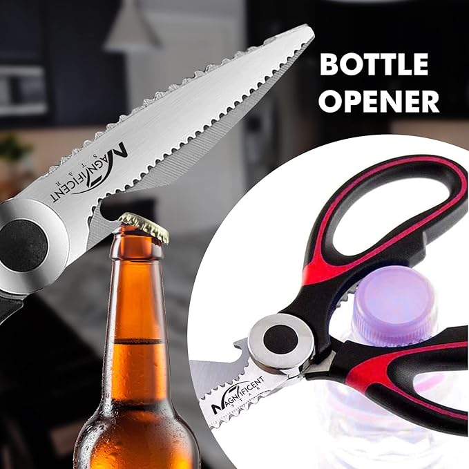 A notable feature of these scissors is the built-in bottle and jar opener. With their sturdy construction and leverage, they make opening tightly sealed containers a breeze. No need for additional tools - these scissors have you covered.