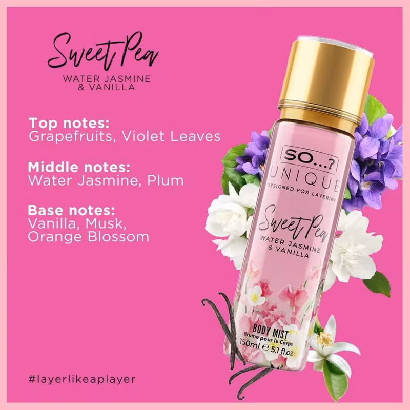 Layer like a player, looking for a perfume that is unique to you? Say hello to our So…? Unique body mist range. Each scent can be worn alone, or adapted and blended for every mood, schedule, and occasion. This bundle contains: So…? Unique Truffle Cream 150ml Body Mist So…? Unique Sweet Pea 150ml Body Mist So…? Unique Cashmere 150ml Body Mist Enjoy these high-quality fragrances that suit all tastes and budgets